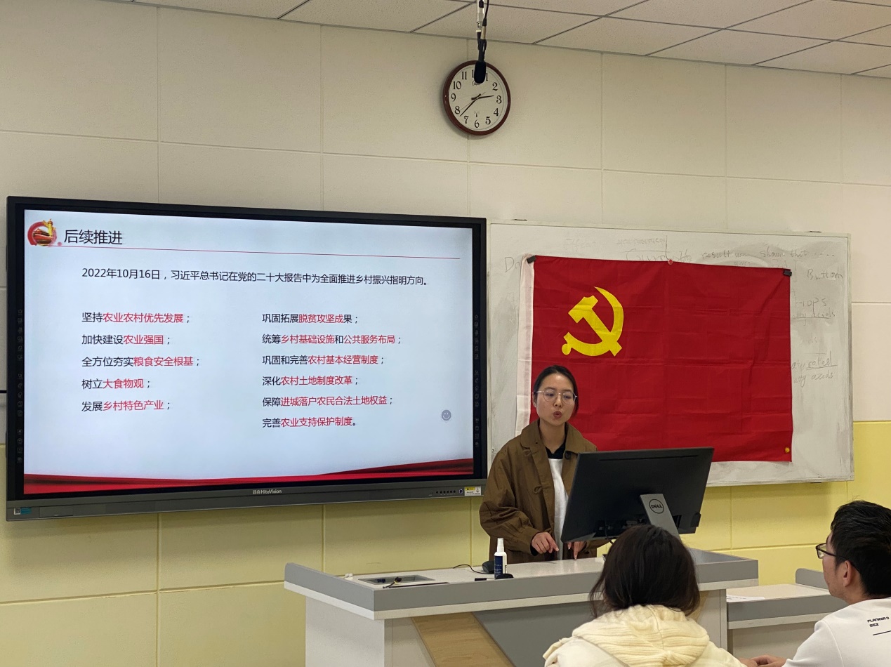 本科生党员张盼盼分享了习近平文化思想的内涵和要求。202310月召开的全国宣传思想文化工作会议,首次提出“习近平文化思想”。习近平总书记对宣传思想文化工作作出重要指示,将“用党的创新理论武装全党、教育人民”作为宣传思想文化工作的首要政治任务,并提出“七个着力”重要要求。支部书记在点评中指出,习近平总书记用三个“事关”深刻揭示了宣传思想文化工作的极端重要性,我们创建样板党支部,打造“七个有力”党支部,宣传有力是重要的组成部分,我们要认真学习贯彻习近平文化思想,用心用情做好习近平文化思想的宣传。